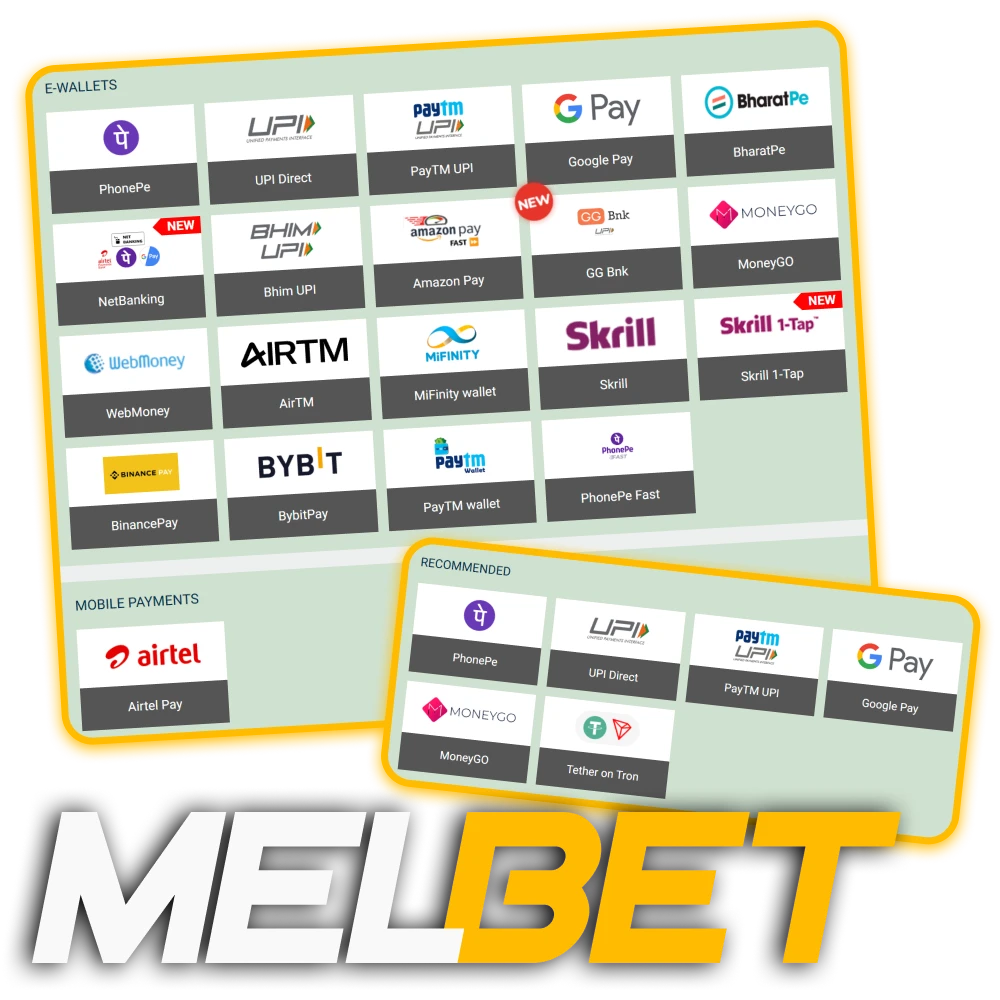 To start gambling activities on the Melbet bet, each player needs to replenish the balance of his gaming account. For your comfort there are many payment methods available, such as UPI, PhonePe, Bank Transfer, Crypto and others. You can start playing at Melbet with a minimum deposit of 45 INR. Increase your first deposit bonus by 30%